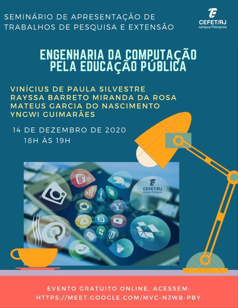 Na próxima segunda-feira, dia 14 de dezembro, será realizado o seminário “Engenharia da Computação pela educação pública”, que contará com a apresentação de trabalhos de pesquisa e extensão de discentes do Cefet/RJ campus Petrópolis. O evento acontecerá pela plataforma Google Meet, das 18h às 19h pelo link https://meet.google.com/mvc-njwb-pby.