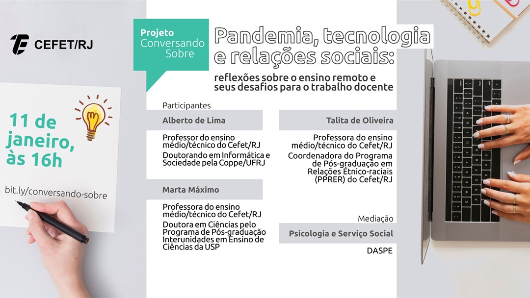 O projeto “Conversando Sobre” irá promover na próxima segunda-feira (11) o terceiro encontro voltado aos servidores do Cefet/RJ. O evento on-line terá como tema "Pandemia, tecnologia e relações sociais: reflexões sobre o ensino remoto e seus desafios para o trabalho docente” e será transmitido às 16h pelo canal do YouTube do projeto. Para participar, basta clicar no link bit.ly/conversando-sobre no dia e horário da atividade.