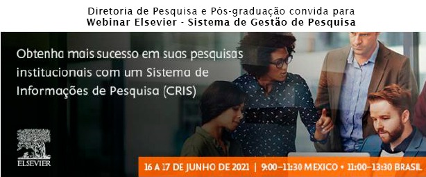 A Diretoria de Pesquisa e Pós-graduação (DIPPG) convida para assistir ao Webinar Elsevier – Sistema de Gestão da Pesquisa: "Obtenha mais sucesso em suas pesquisas institucionais com um Sistema de Informações de Pesquisa (CRIS)".