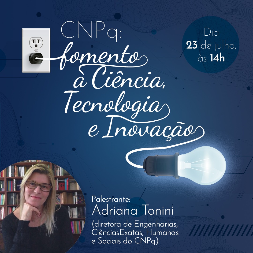 No dia 23 de julho, às 14h, o Conselho Nacional de Desenvolvimento Científico e Tecnológico (CNPq) promove a palestra on-line intitulada “CNPq: fomento à Ciência, Tecnologia e Inovação”, que será ministrada pela diretora de Engenharia, Ciências Exatas, Humanas e Sociais do CNPq, Adriana Tonini.