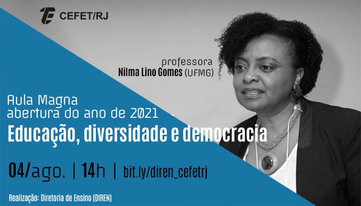 A Diretoria de Ensino (DIREN) do Cefet/RJ convoca toda a comunidade acadêmica para assistir à aula magna de abertura do ano letivo de 2021 com a Prof.ª Dra. Nilma Lino Gomes, titular emérita da Faculdade de Educação da Universidade Federal de Minas Gerais. O encontro virtual será realizado em 4 de agosto, às 14h, e terá como tema “Educação, diversidade e democracia”. A atividade será transmitida pelo canal da DIREN no YouTube e não há necessidade de inscrição prévia.