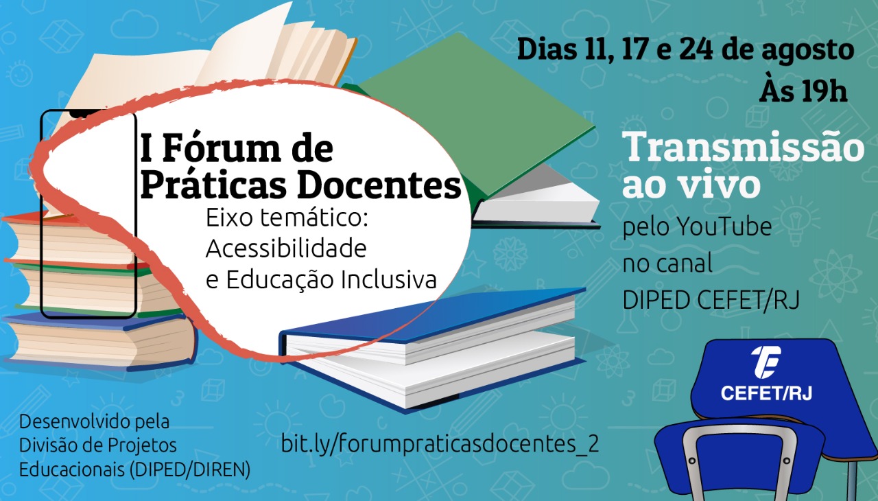 A partir do dia 11 deste mês, o Cefet/RJ dará prosseguimento ao I Fórum de Práticas Docentes, uma proposta de formação continuada para profissionais da educação, especialmente voltada àqueles que se dedicam às atividades de ensino. Seu objetivo é promover a reflexão conceitual acerca de acessibilidade, tecnologia assistiva e educação inclusiva nos ensinos médio e superior. As atividades do eixo temático “Acessibilidade e Educação Inclusiva” serão realizadas nos dias 11, 17 e 24 de agosto. O evento é aberto aos públicos interno e externo do Cefet/RJ e será realizado de forma remota, com transmissão ao vivo pelo YouTube, às 19h.