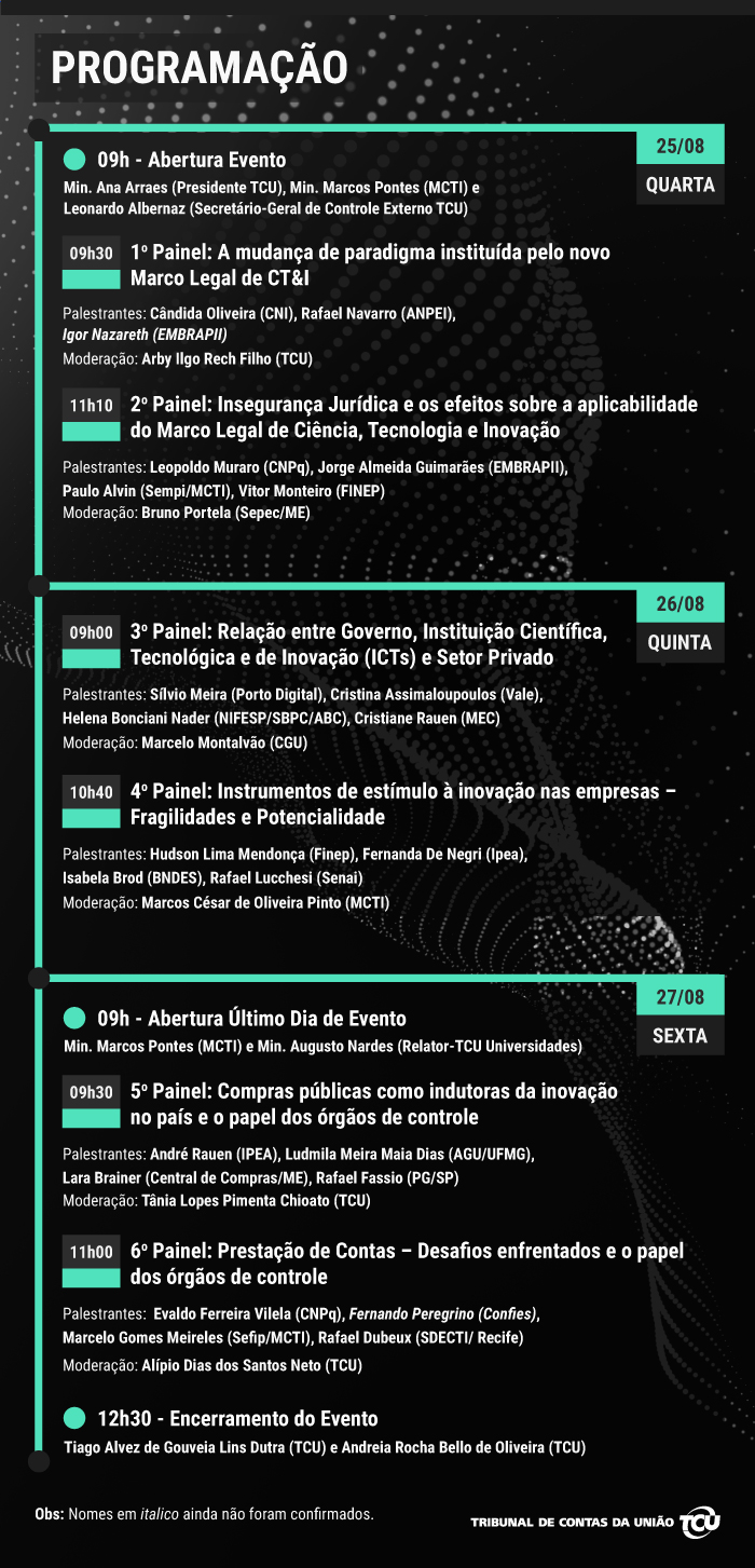 O Tribunal de Contas da União (TCU) convida para o evento “Ciclo de debates sobre o Marco Legal de Ciência, Tecnologia e Inovação: desafios e dificuldades na implementação”, que será realizado nos dias 25, 26 e 27 de agosto de 2021, às 9h. O evento será transmitido pelo canal oficial do TCU no YouTube.