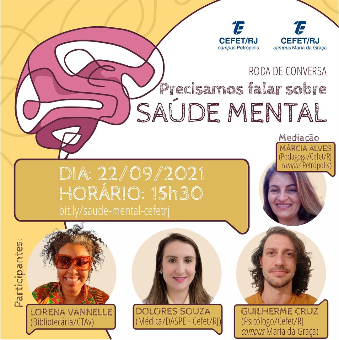 Intitulada “Precisamos falar sobre saúde mental”, a roda de conversa contará com a presença de Dolores Souza, médica da Divisão de Atenção à Saúde e Perícias (DASPE) do Cefet/RJ; Guilherme Cruz, psicólogo do Cefet/RJ campus Maria da Graça; e Lorena Vannelle, bibliotecária do Centro Técnico Audiovisual (CTAv), que é formada também em História e cursa, atualmente, Serviço Social. Ao reunir profissionais de diferentes áreas de atuação, o evento busca ampliar o debate acerca da promoção da saúde mental e da prevenção ao suicídio, como estratégia para dar maior visibilidade ao tema entre estudantes, professores, responsáveis e profissionais técnicos, entre outros.