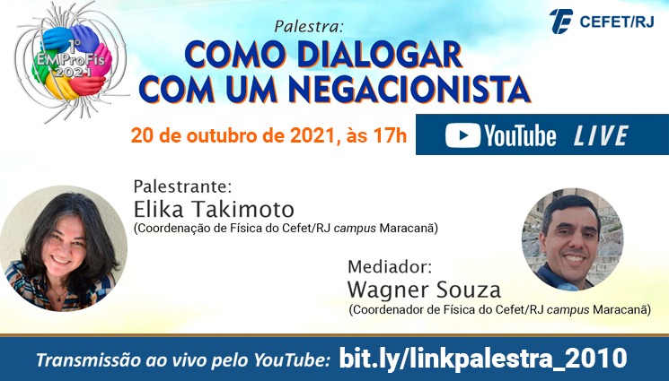 No próximo dia 20 de outubro, acontecerá a palestra “Como dialogar com um negacionista”, que compõe o 1º Encontro de Física dos professores do Cefet/RJ. O evento on-line, que será transmitido pelo YouTube a partir das 17h, terá Elika Takimoto como palestrante e será mediado por Wagner Souza, ambos docentes da instituição. O encontro é aberto ao público e, para ter direito ao certificado, os interessados devem se inscrever pelo link disponível no Microsoft Forms.