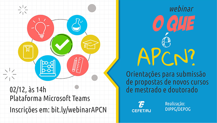 No dia 2 de dezembro, às 14h, o Departamento de Pesquisa e Pós-Graduação (DEPOG) do Cefet/RJ promoverá o webinar “O que é APCN? Orientações para submissão de propostas de novos cursos de mestrado e doutorado”. O evento será transmitido pela plataforma Microsoft Teams e é voltado aos docentes da instituição. Toda a comunidade do Cefet/RJ pode participar e os interessados devem acessar a página de inscrições para se registrarem.