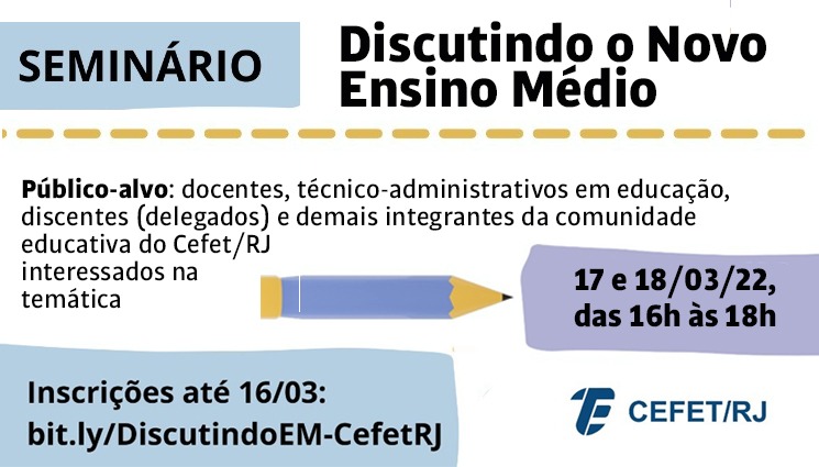 A Comissão de Trabalho e Estudos sobre o Novo Ensino Médio convida a comunidade educativa do Cefet/RJ a participar do seminário interno “Discutindo o Novo Ensino Médio”, que será realizado nos dias 17 e 18/03/2022. O evento será transmitido pela plataforma Microsoft Teams, das 16h às 18h – podendo ser estendido em até uma hora, caso seja necessário. As inscrições poderão ser feitas até as 18h de quarta-feira (16) pelo link https://bit.ly/DiscutindoEM-CefetRJ. No formulário, há um campo onde as pessoas inscritas podem indicar questões que gostariam de ver tratadas no seminário.