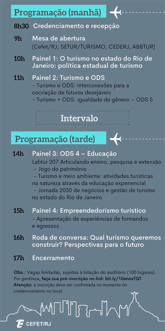 A programação irá acontecer no dia 27/09, Dia Mundial do Turismo, das 8h30 às 17h, no Auditório 2 da Unidade Maracanã, e marca a comemoração dos 10 anos do curso. As vagas são limitadas à lotação do auditório (100 lugares). Clique aqui para realizar a pré-inscrição.