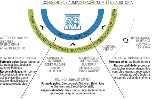 A estrutura de controle interno e gestão de riscos do Cefet/RJ é baseada no modelo de três linhas de defesa, em que cada grupo de têm papéis e responsabilidades específicas e devem atuar de maneira coordenada, ajudando a garantir o sucesso contínuo das iniciativas de gerenciamento de risco, conforme demostrado na figura a seguir.