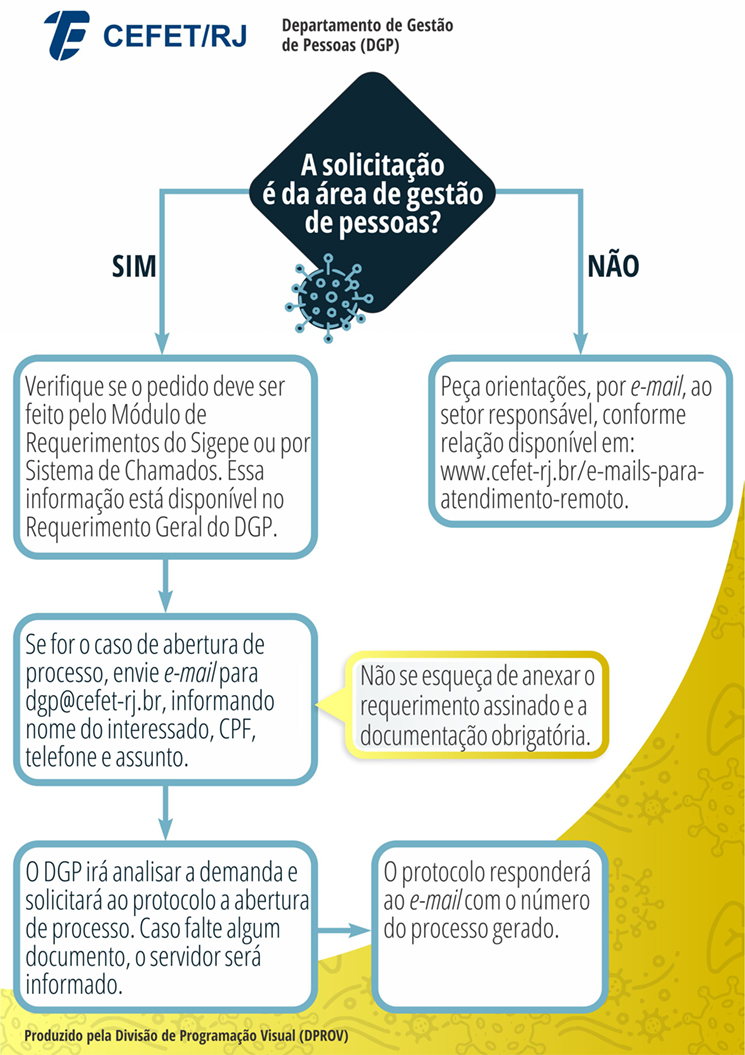 Nos casos de solicitações que envolvam gestão de pessoas, o solicitante deverá encaminhar e-mail para O endereço de e-mail address está sendo protegido de spambots. Você precisa ativar o JavaScript enabled para vê-lo., contendo o Requerimento Geral do Departamento de Gestão de Pessoas devidamente preenchido e assinado, acompanhado da documentação comprobatória. O DGP irá analisar a demanda e, caso seja necessário, solicitará ao Protocolo a abertura de processo. O Protocolo responderá com o número do processo gerado. Para processos referentes aos demais assuntos, o e-mail deverá ser direcionado aos setores responsáveis, que seguirão o mesmo procedimento. A relação de contatos para atendimento remoto está disponível no site do Cefet/RJ.