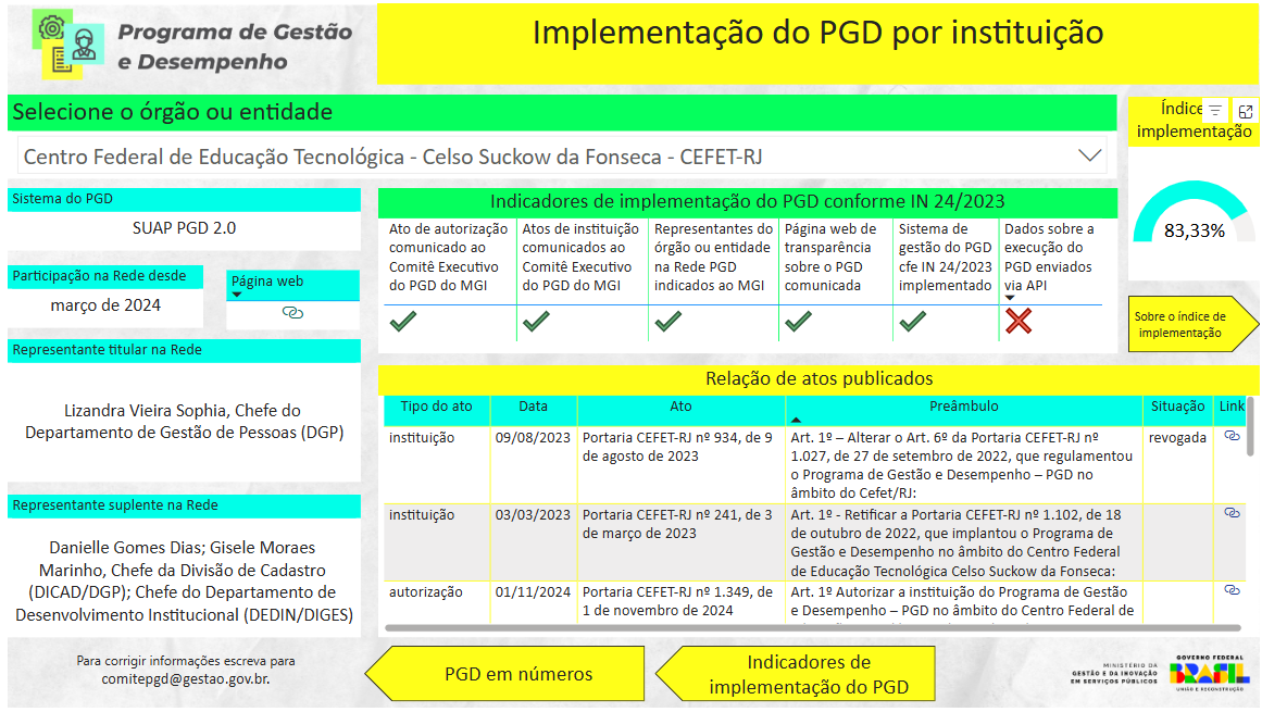 O painel de implementação do PGD apresenta o avanço das autorizações do programa na Administração Pública Federal. Nele são apresentados dados sobre quando a iniciativa foi autorizada nos órgãos e entidades, os atos publicados, quais sistemas são utilizados e outras informações. O painel é consolidado pelo MGI utilizando informações publicadas no Diário Oficial da União e em contatos realizados com órgãos e entidades.
