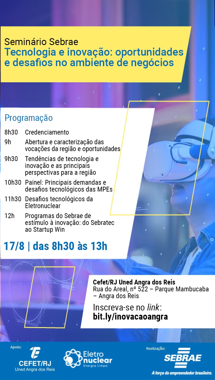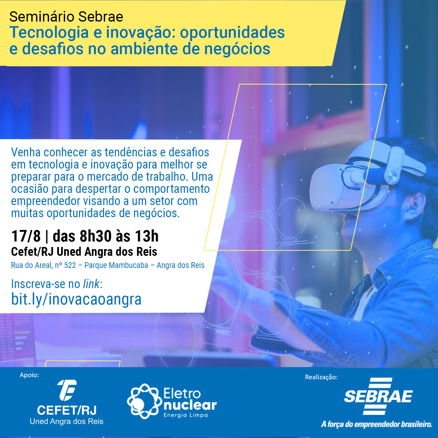 No dia 17 de agosto, o Cefet/RJ Uned Angra dos Reis e o Sebrae/RJ irão realizar o seminário “Tecnologia e inovação: oportunidades e desafios no ambiente de negócios”. O evento, que acontecerá nas dependências da Uned Angra, é direcionado a alunos e colaboradores da instituição. Haverá programação das 8h30 às 13h e os participantes terão direito a certificado. Os interessados devem se inscrever pelo link: bit.ly/inovacaoangra.