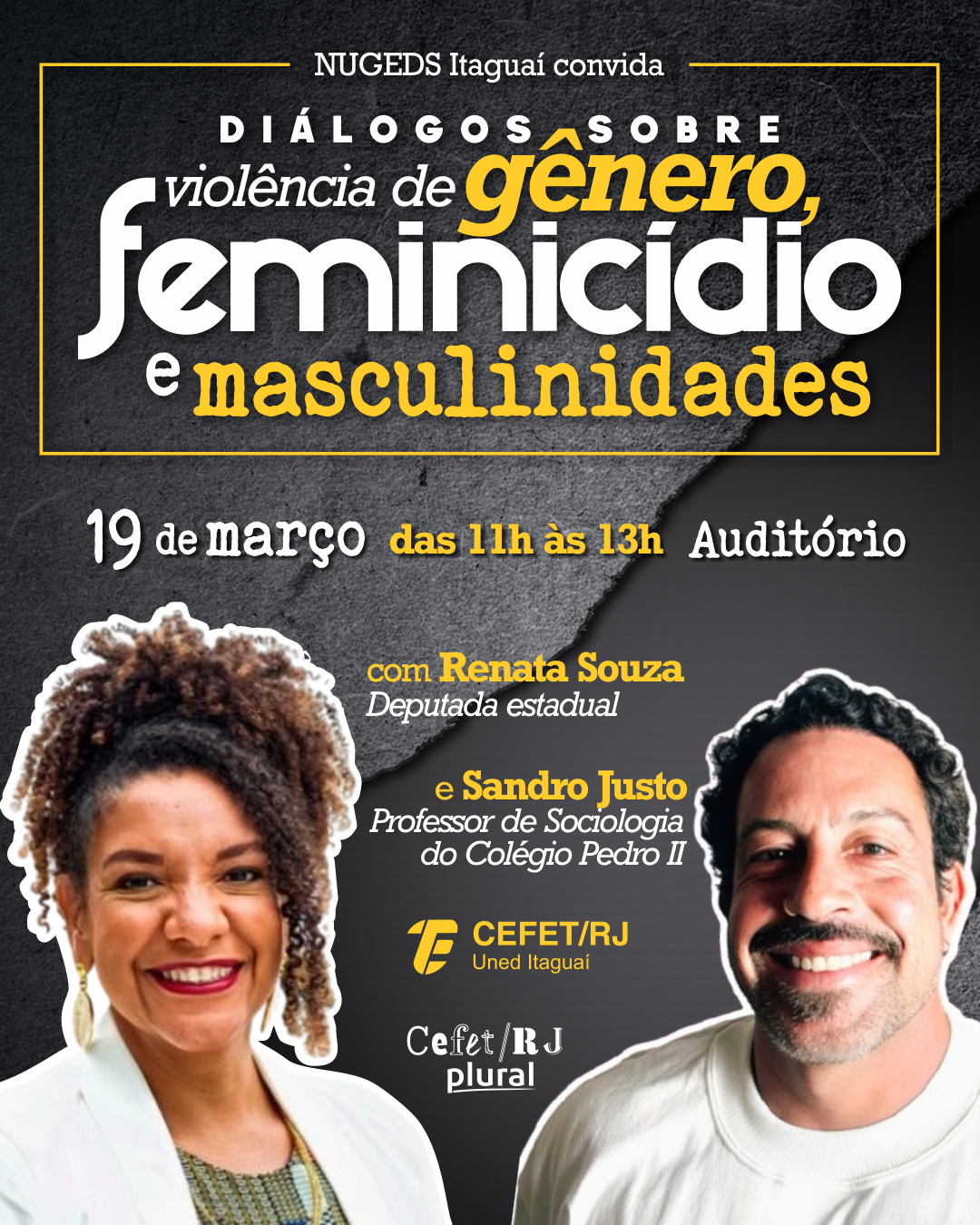 O Núcleo de Gênero e Diversidade Sexual (NUGEDS) da Uned Itaguaí convida a comunidade para o evento “Diálogos sobre violência de gênero, feminicídio e masculinidades”, que será realizado nesta quinta-feira (19), às 11h, no auditório da unidade. A atividade contará com a participação da deputada estadual Renata Souza e de Sandro Justo, professor de Sociologia do Colégio Pedro II.