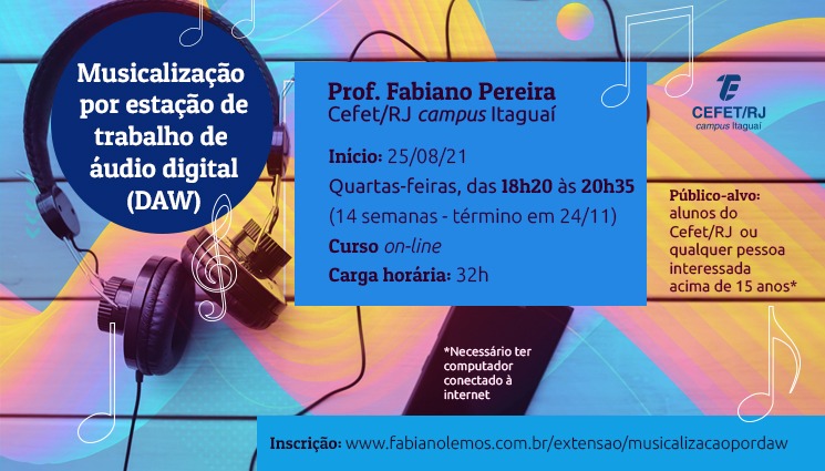 O Cefet/RJ divulga o curso on-line “Musicalização por estação de trabalho de áudio digital (DAW)”, com início a partir de 25 de agosto. Uma iniciativa do professor Fabiano Lemos Pereira, do campus Itaguaí, o curso tem por objetivo propiciar ao aluno conhecimentos básicos sobre música. Não é obrigatório possuir instrumento musical ou saber tocar para se inscrever, embora seja desejável que o aluno tenha, ao menos, conhecimento iniciante em algum instrumento musical convencional, em canto ou seja DJ.