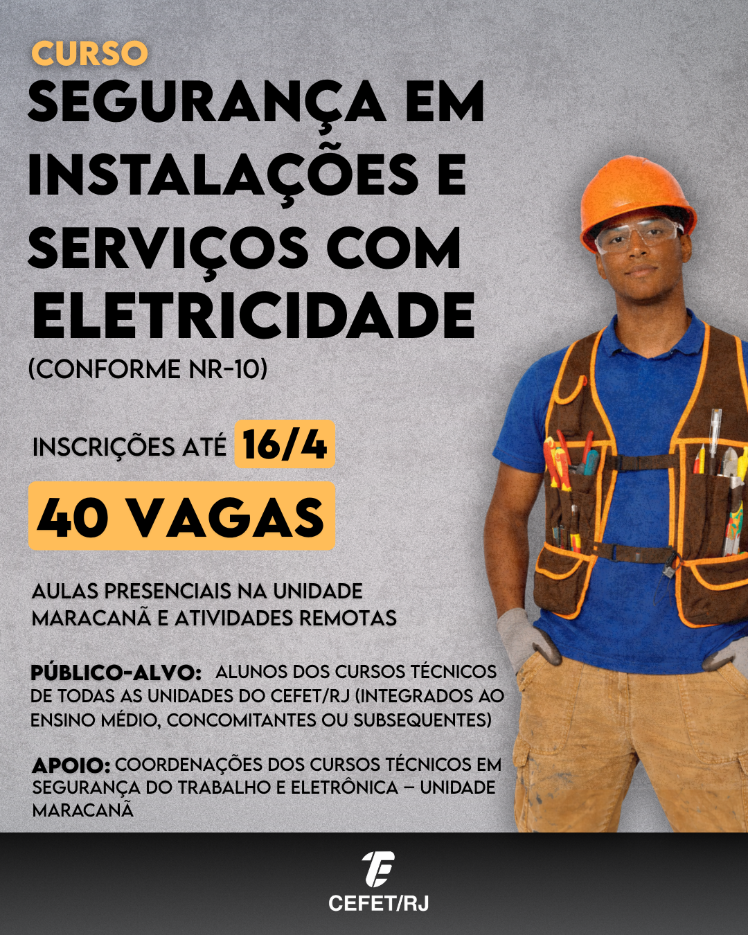 Estão abertas, até o dia 16 de abril, as inscrições para o curso “Segurança em instalações e serviços com eletricidade”, oferecido pelas coordenações dos cursos técnicos em Segurança do Trabalho e Eletrônica da Unidade Maracanã. A oportunidade é destinada a alunos do cursos técnicos de todas as unidades do Cefet/RJ (integrados ao ensino médio, concomitantes ou subsequentes). Serão ofertadas 40 vagas a serem preenchidas por ordem de inscrição. Os interessados devem responder ao formulário on-line.