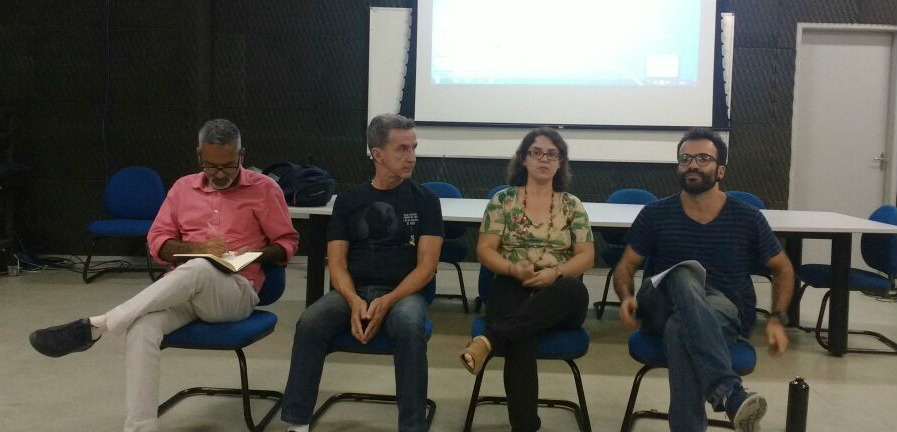 Os docentes Samuel de Oliveira (à direita), Talita de Oliveira, Carlos Henrique Martins e Roberto Borges na mesa “O mestrado em Relações Étnico-raciais, produção de conhecimento e a luta antirracismo”