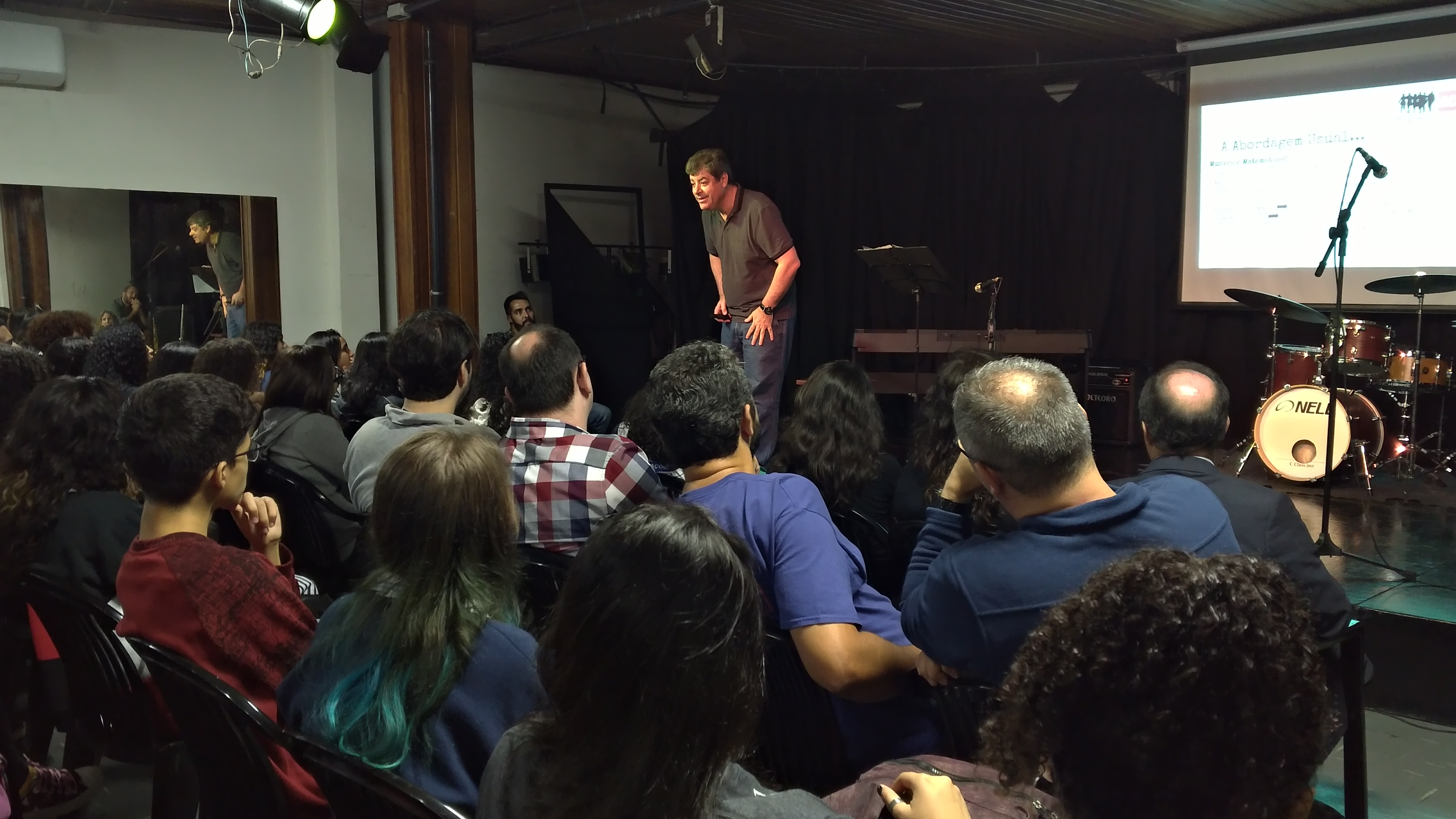 Durante a palestra no auditório de artes, o professor fez diversos experimentos musicais com a plateia, mostrando na prática seus estudos sobre as relações matemáticas em ritmos como samba, bossa nova e rumba. Além disso, o professor contou como essas descobertas se transformaram em uma metodologia de ensino de matemática para alunos deficientes visuais no Instituto Benjamin Constant. “Jovens que não enxergam não têm os mesmos recursos visuais para estudar matemática. Para ensinar frações numéricas, por exemplo, eles teriam que buscar uma compreensão pelo tato, mas a música me proporcionou tornar isso compreensível para eles de outra forma.”