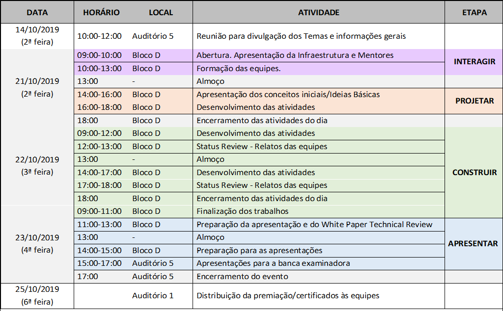 - Construir: etapa em que os participantes terão acesso a ferramentas e materiais para construção dos protótipos.