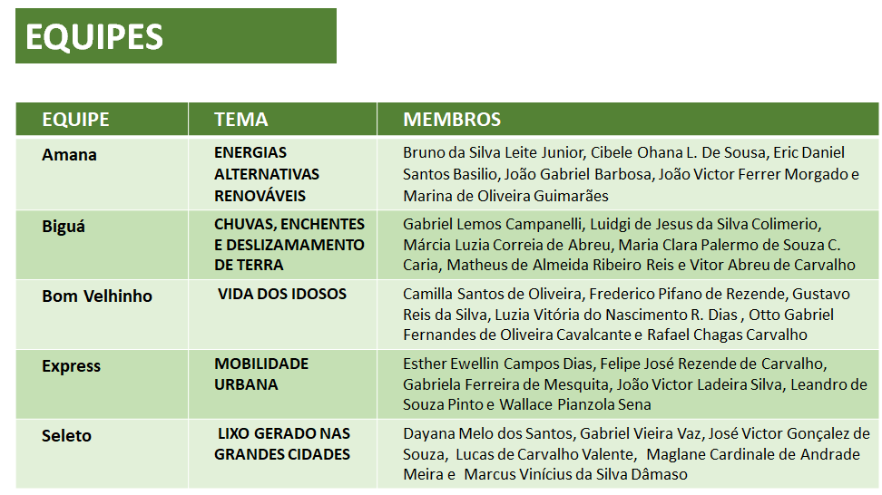 Abaixo, a relação das equipes participantes e a classificação final do desafio: