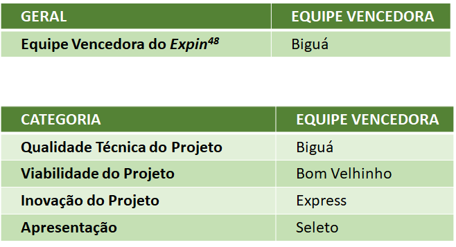 A vencedora geral do Expin48 foi a equipe Biguá, que projetou um Tampo Ajustável de Encaixe Fácil (TAEF) para bueiros de rua. Uma solução para aliviar a pressão de dentro do bueiro e impedir a saída do tampo, evitando acidentes relacionados a bueiros em dias de chuva ou enchentes. O projeto consiste na adaptação de três hastes para os tampos de bueiro, sendo uma delas móvel para possibilitar o encaixe.