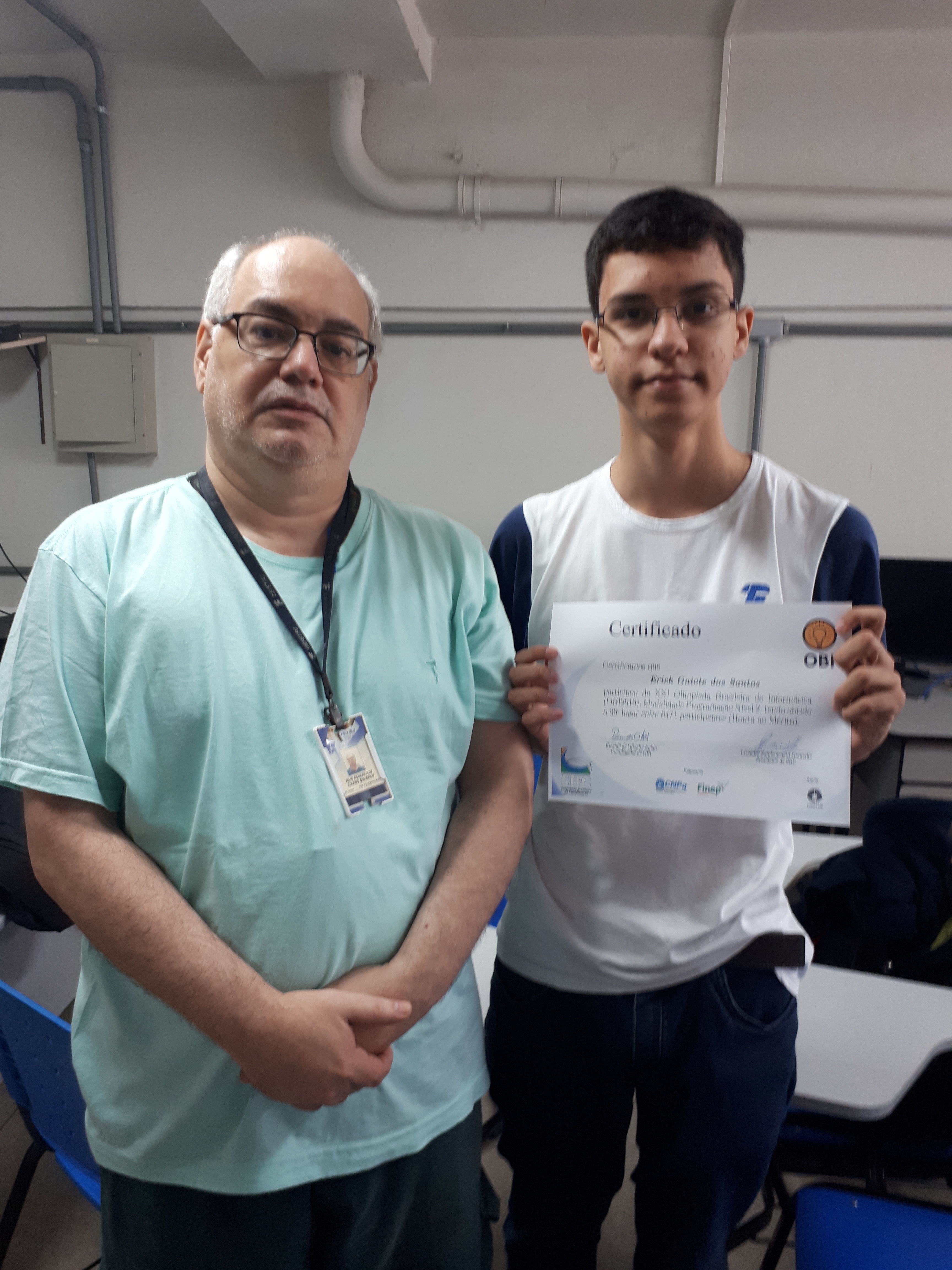O aluno do curso técnico em Informática do Cefet/RJ campus Maracanã Erick Gaiote recebeu a premiação de Honra ao Mérito na modalidade Programação Nível 2 da Olimpíada Brasileira de Informática (OBI) 2019. O estudante, que participa do Grupo Robótica Maracanã, foi classificado em 39º lugar entre 6.471 participantes dessa modalidade da competição. A OBI 2019 foi realizada entre maio e outubro de 2019 e contou com três fases (local, estadual e nacional), em que os estudantes competiram em seis categorias.