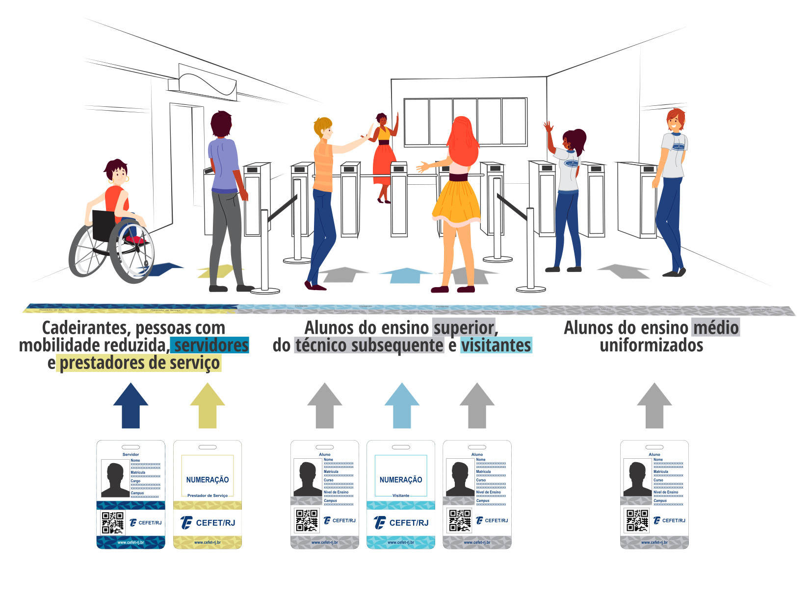 - Professores e técnico-administrativos – as catracas estarão liberadas e o controle de acesso desses profissionais será realizado apenas por um vigilante. Para acessar o prédio, professores e técnico-administrativos deverão utilizar crachá de servidor ou apresentar carteira funcional, disponível no aplicativo Sigepe. Crachás antigos e outros documentos que comprovem o vínculo do servidor com a instituição também serão aceitos. Para facilitar o fluxo de pessoas, pede-se que o servidor mantenha o crachá ou documento visível ao entrar no campus.