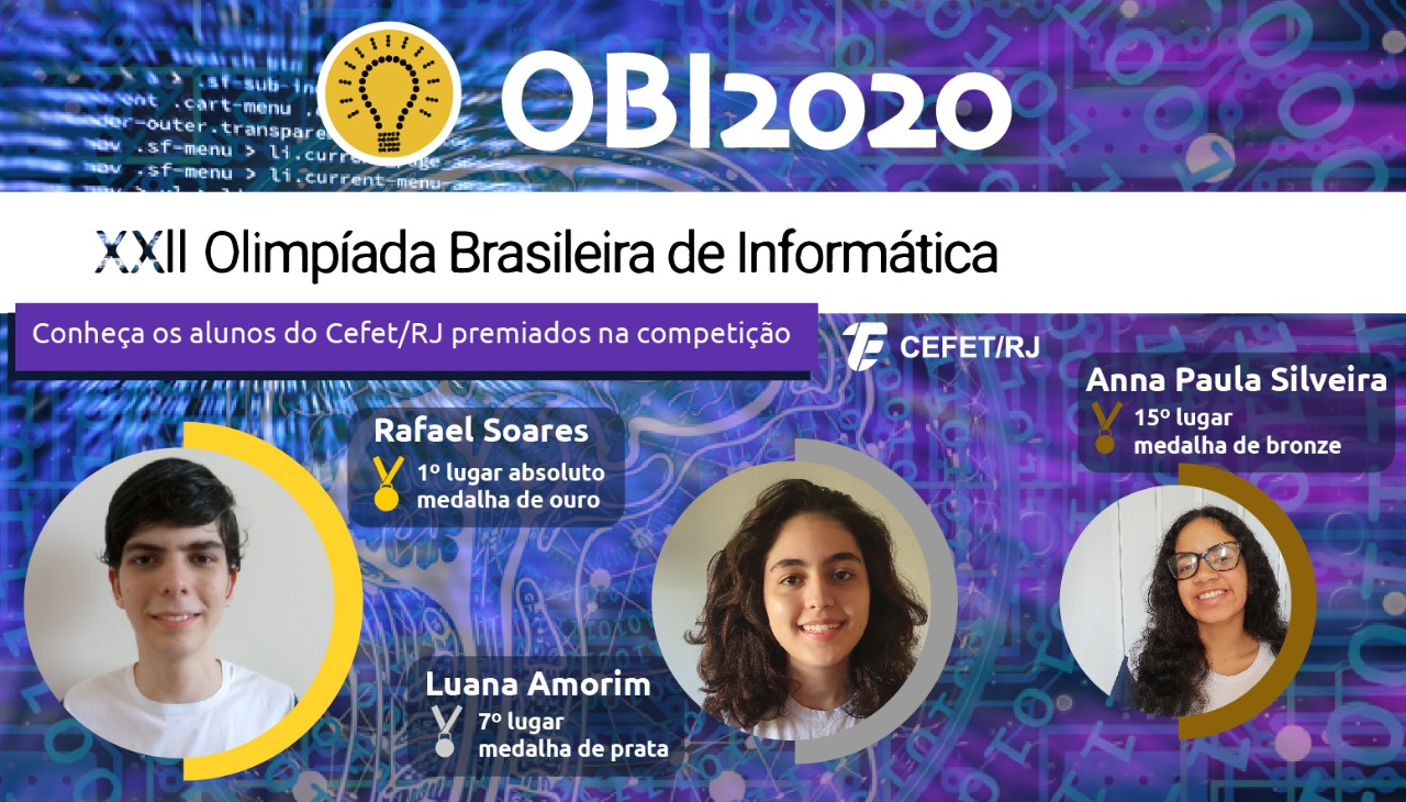 Os alunos Rafael Soares, Luana Amorim e Anna Paula Silveira, do curso técnico em Informática do campus Maracanã, conquistaram, respectivamente, o 1º lugar (medalha de ouro), o 7º lugar (prata) e o 15º lugar (bronze) na modalidade Programação Nível 1 da Olimpíada Brasileira de Informática (OBI) 2020. Rafael Soares foi o grande destaque da categoria. O estudante alcançou a pontuação máxima e ficou em primeiro lugar absoluto entre os premiados, conquistando a primeira medalha de ouro do Cefet/RJ na competição.