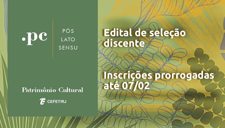 A Diretoria de Pesquisa e Pós-graduação (DIPPG), por meio da Coordenação Geral de Cursos Lato Sensu (CGLAT), informa que foram prorrogadas até o dia 7 de fevereiro as inscrições na seleção discente para o curso de pós-graduação lato sensu em Patrimônio Cultural. O curso será ofertado no campus Maracanã do Cefet/RJ. Clique no link para ter acesso ao novo cronograma.
