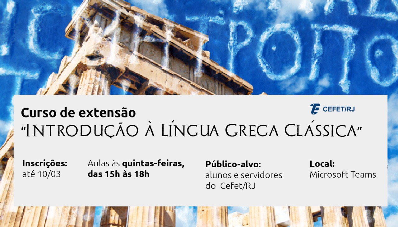 O projeto de extensão em língua grega clássica, vinculado ao campus Maracanã, está com inscrições abertas até o dia 10 de março para quem deseja realizar o curso introdutório na língua. O conteúdo será voltado para aqueles que não possuem conhecimentos anteriores em grego clássico. As aulas irão ocorrer de forma remota, por meio da plataforma Microsoft Teams.