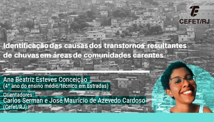 A aluna Ana Beatriz Esteves Conceição, do 4° ano do ensino médio/técnico em Estradas do campus Maracanã do Cefet/RJ, teve seu trabalho intitulado "Identificação das causas dos transtornos resultantes de chuvas em áreas de comunidades carentes" aceito para publicação no site do Serviço Geológico do Brasil.
