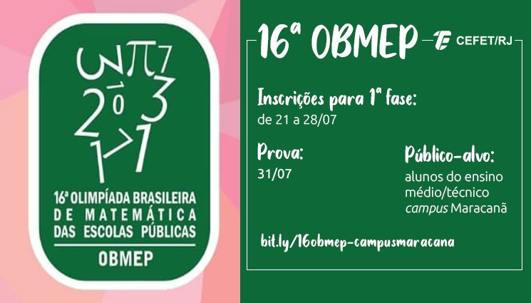 Estão abertas, de 21 a 28 de julho, as inscrições de alunos do ensino médio/técnico do Cefet/RJ campus Maracanã para a primeira fase da 16ª Olimpíada Brasileira de Matemática das Escolas Públicas (OBMEP). A avaliação iniciará às 7h da manhã do dia 31 de julho e deverá ser realizada em até 2 horas e 30 minutos.