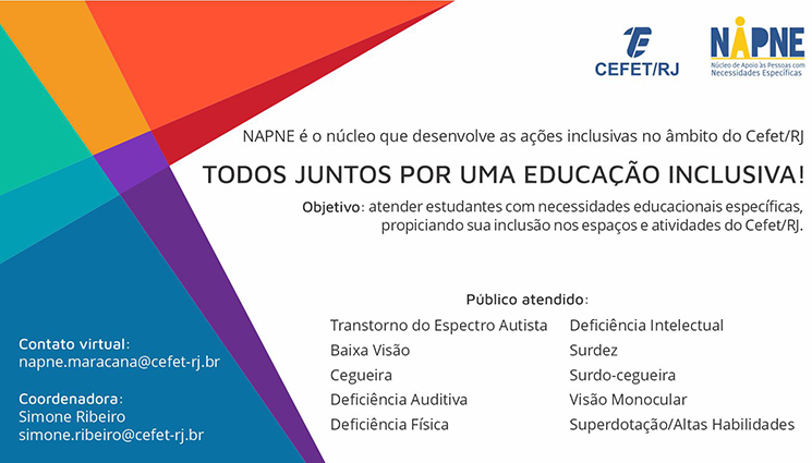 O NAPNE foi instituído no Cefet/RJ em 2004, com o propósito de atender a estudantes com necessidades educacionais específicas. O núcleo atua no apoio a estudantes com deficiências, transtorno global do desenvolvimento e altas habilidades nas atividades de ensino, pesquisa e extensão da instituição, de acordo com a Lei de Diretrizes e Bases da Educação Nacional (Lei nº 9.394, de 20 de dezembro de 1996).