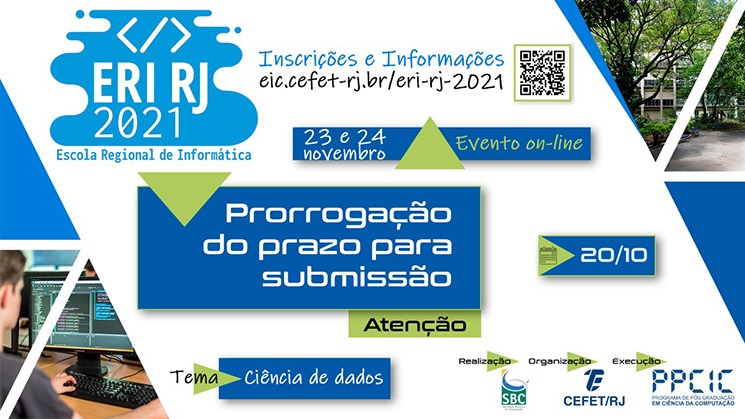 Nos dias 23 e 24 de novembro, a Sociedade Brasileira de Computação realizará a IV Escola Regional de Informática (ERI-RJ 2021), que, nesta edição, está sendo organizada pelo Cefet/RJ. O evento oferecerá atividades como minicursos, mesas-redondas, sessões temáticas, posters e palestras e será transmitido pelo canal do Programa de Pós-Graduação em Ciência da Computação do Cefet/RJ no YouTube. A submissão de trabalhos para o evento pode ser realizada até 20 de outubro pelo link https://jems.sbc.org.br/home.cgi?c=3960