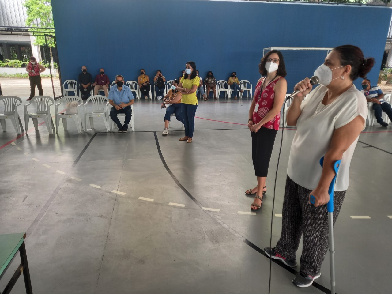 Irene de Barcelos, coordenadora do DEMET, se apresenta aos estudantes na quadra de esportes