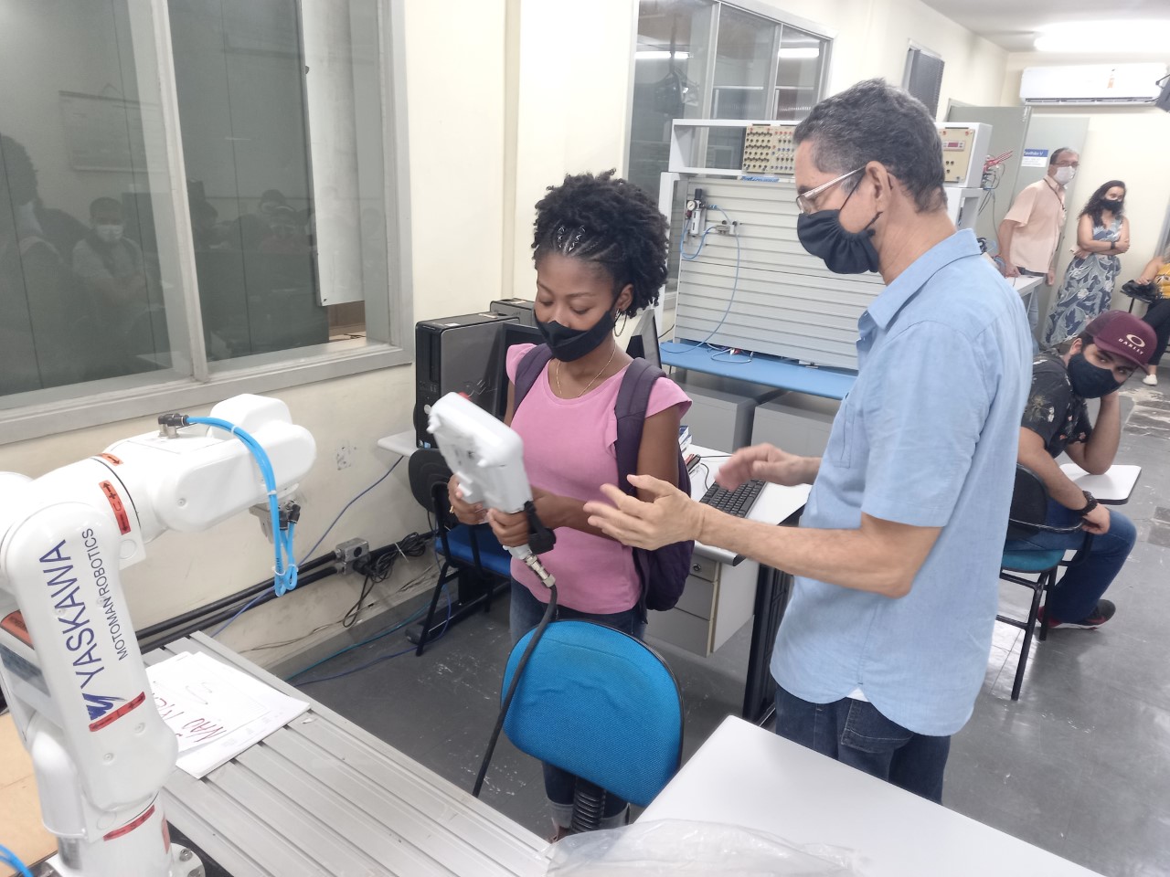 Isabela Azevedo, ao lado do professor Heitor Mendes, conhecendo o Laboratório de Automação Industrial