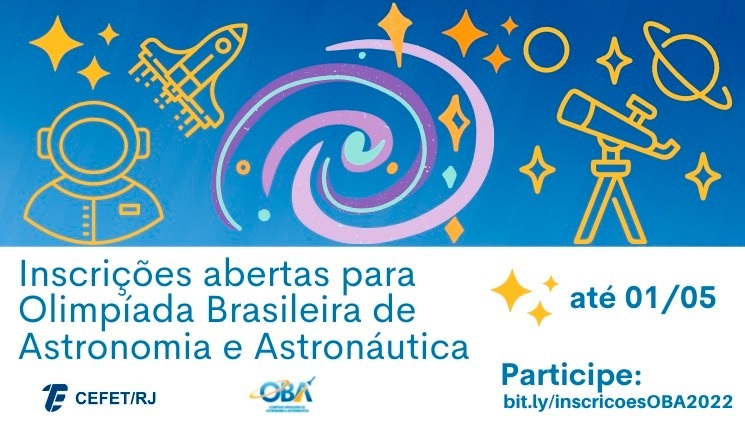 Estudantes do primeiro ao último ano do ensino médio do Cefet/RJ já podem se inscrever na Olimpíada Brasileira de Astronomia e Astronáutica (OBA 2022). As inscrições se encerram às 19 horas do dia 01/05 e devem ser realizadas por meio do preenchimento do formulário disponível no link https://bit.ly/inscricoesOBA2022f.