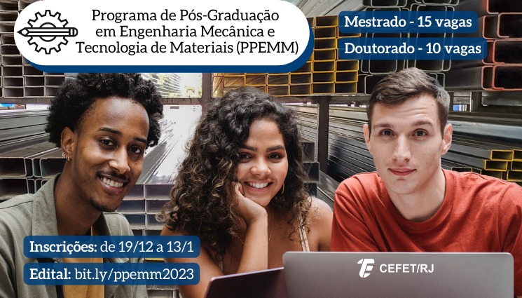 Já estão disponíveis para consulta os editais do Programa de Pós-Graduação em Engenharia Mecânica e Tecnologia de Materiais (PPEMM). Os processos seletivos irão ofertar 15 vagas para o mestrado e 10 para o doutorado, com ingresso no primeiro período de 2023. Os cursos são ofertados pela Unidade Maracanã.