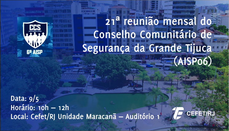 No dia 9 de maio, o Cefet/RJ irá sediar a 21ª reunião mensal do Conselho Comunitário de Segurança da Grande Tijuca (AISP06). O evento irá debater questões relativas à segurança, com a participação do diretor-geral da instituição, Mauricio Saldanha Motta, e de representantes das forças de segurança pública da região. A reunião será realizada no Auditório 1 da Unidade Maracanã, das 10h às 12h.