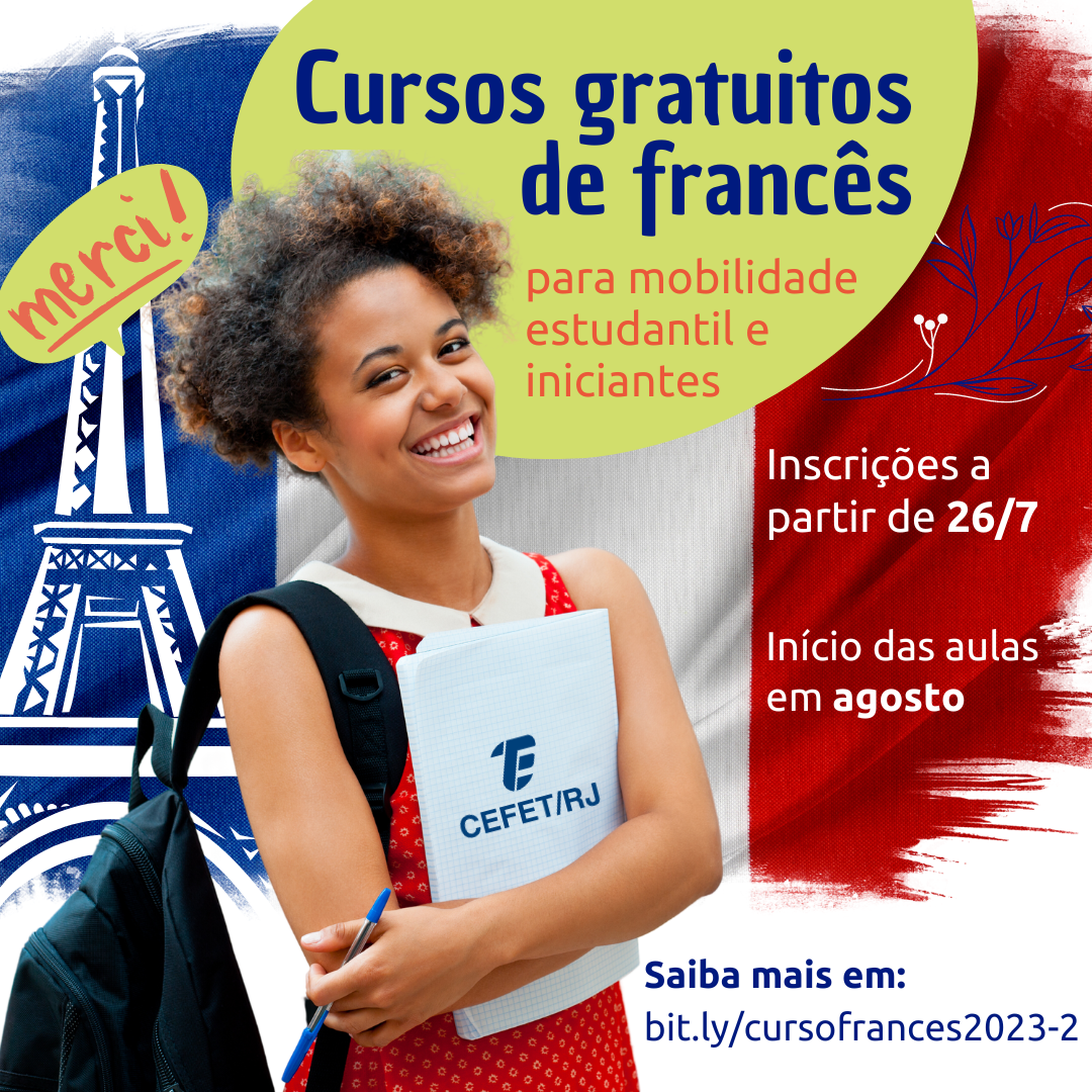 A partir de 26 de julho, pessoas interessadas em aprender ou se aprofundar em um novo idioma terão a oportunidade de se inscrever em cursos gratuitos de francês, com aulas na Unidade Maracanã. Serão ofertadas 20 vagas para cada modalidade, destinadas ao público em geral, e preenchidas por ordem de inscrição. Haverá reserva de vagas para alunos, professores e técnico-administrativos do Cefet/RJ. Os participantes terão direito a certificado, emitido pelo Departamento de Extensão e Assuntos Comunitários (DEAC).