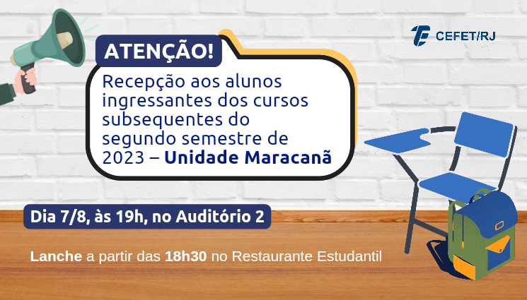 O Departamento de Ensino Médio e Técnico (DEMET) do Cefet/RJ informa que a recepção aos alunos ingressantes nos cursos técnicos subsequentes da Unidade Maracanã será realizada no dia 7/8, a partir das 18h30.