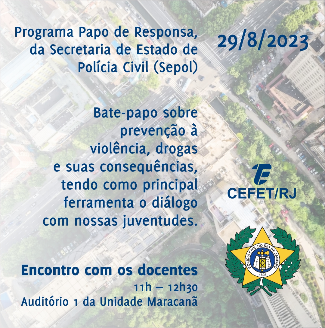 No dia 29 de agosto, o Departamento de Ensino Médio e Técnico (DEMET) promoverá o encontro dos docentes da Unidade Maracanã com o programa Papo de Responsa, da Secretaria de Estado de Polícia Civil (Sepol). O evento acontecerá no Auditório 1, das 11h às 12h30. Não é necessário realizar inscrição.