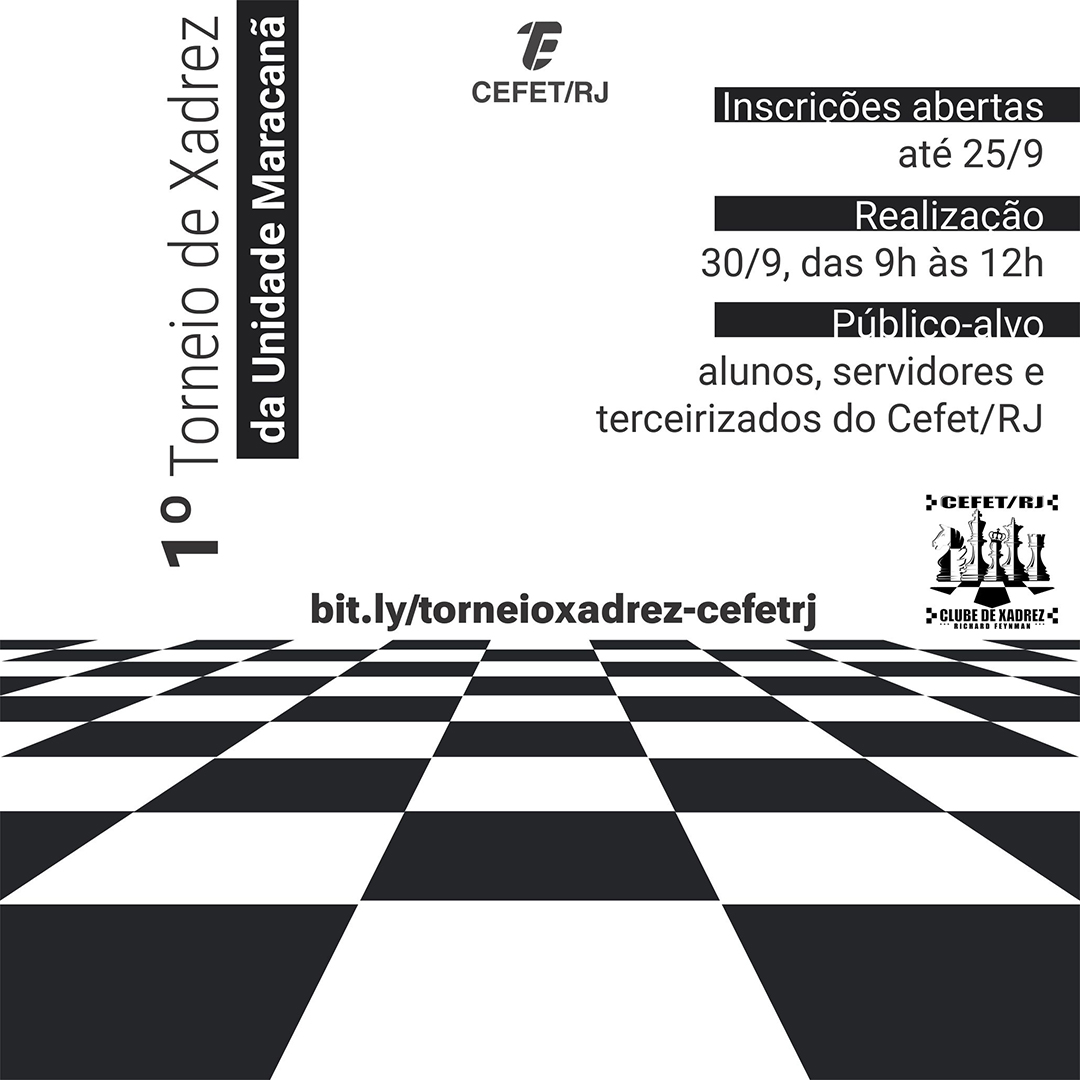 O projeto Clube de Xadrez Richard Feynman abriu as inscrições para o 1º Torneio de Xadrez da Unidade Maracanã. A oportunidade é aberta a toda a comunidade acadêmica do Cefet/RJ e os competidores têm até o dia 25 de setembro para se inscrever. A disputa acontecerá no dia 30 de setembro, das 9h às 12h, na quadra esportiva da unidade. A iniciativa é do professor Wagner Souza, da Coordenação de Física.