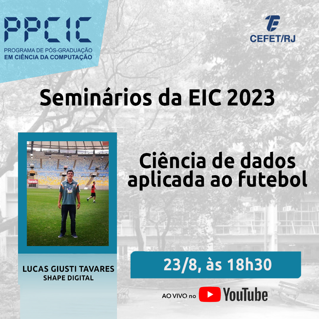 Na próxima quarta-feira (23), o projeto Seminários da Escola de Informática e Computação (SEIC) irá promover uma palestra on-line sobre o tema “Ciência de dados aplicada ao futebol”, com apresentação de Lucas Giusti Tavares, da empresa Shape Digital. O encontro será transmitido pelo canal do Programa de Pós-Graduação em Ciência da Computação (PPCIC) no YouTube, a partir das 18h30. A gravação ficará disponível para posterior visualização.