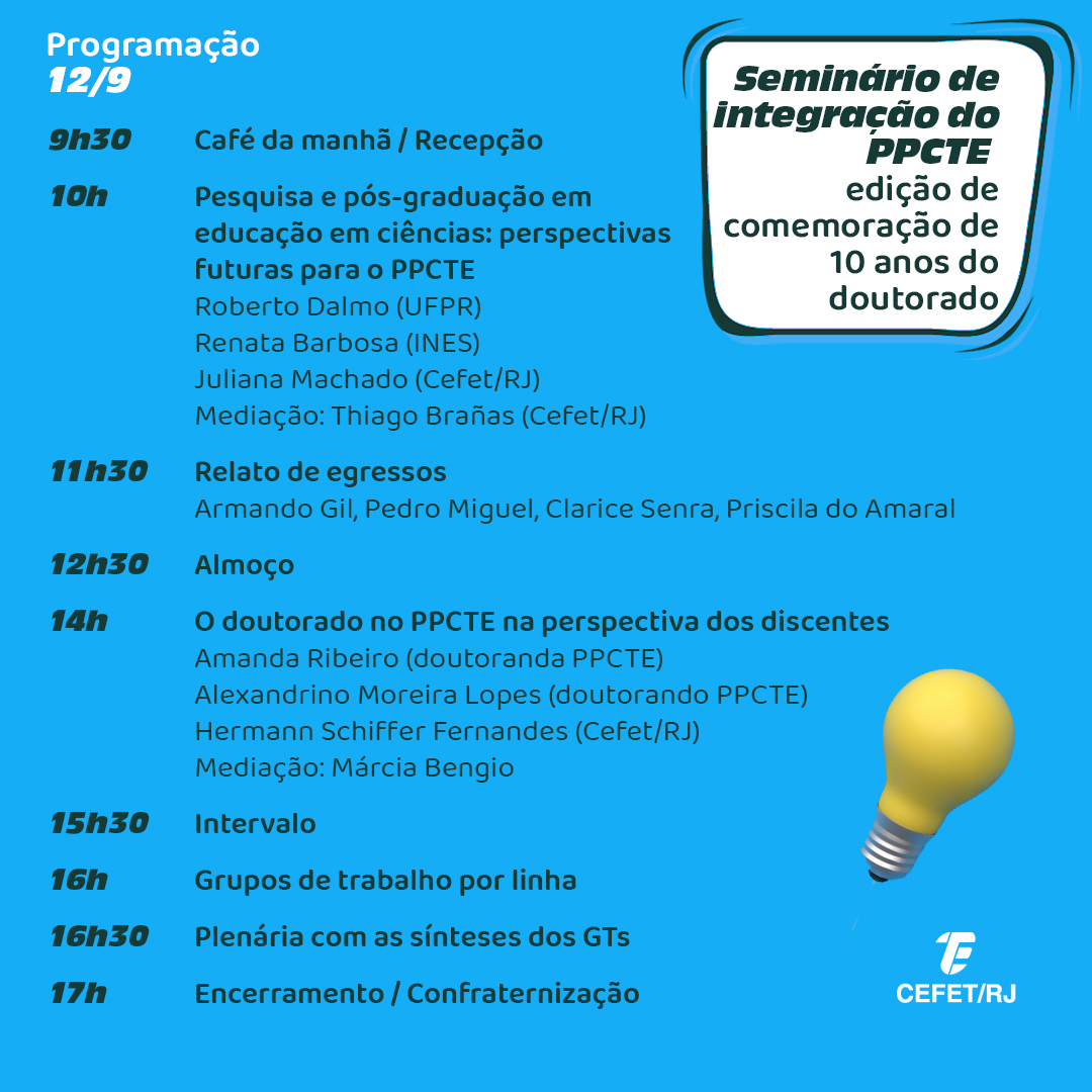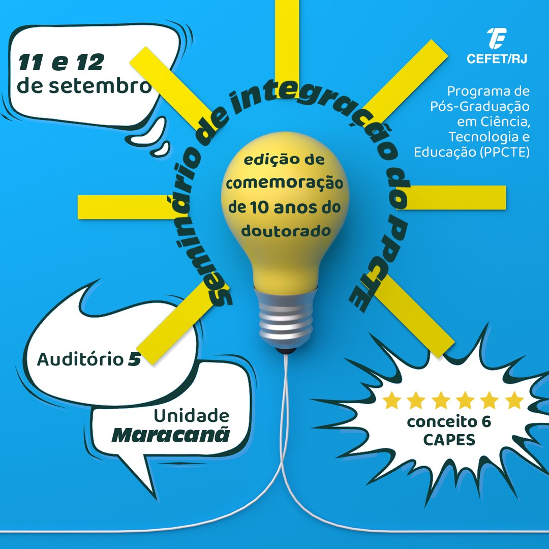 Nos dias 11 e 12 de setembro, o Programa de Pós-Graduação em Ciência, Tecnologia e Educação (PPCTE) irá promover o “Seminário de integração do PPCTE: edição de comemoração de 10 anos do doutorado”, com o propósito de celebrar o primeiro curso de doutorado implantado pelo Cefet/RJ. O evento acontecerá no Auditório 5 da Unidade Maracanã e não será necessário realizar inscrição prévia. Os participantes terão direito a certificado.