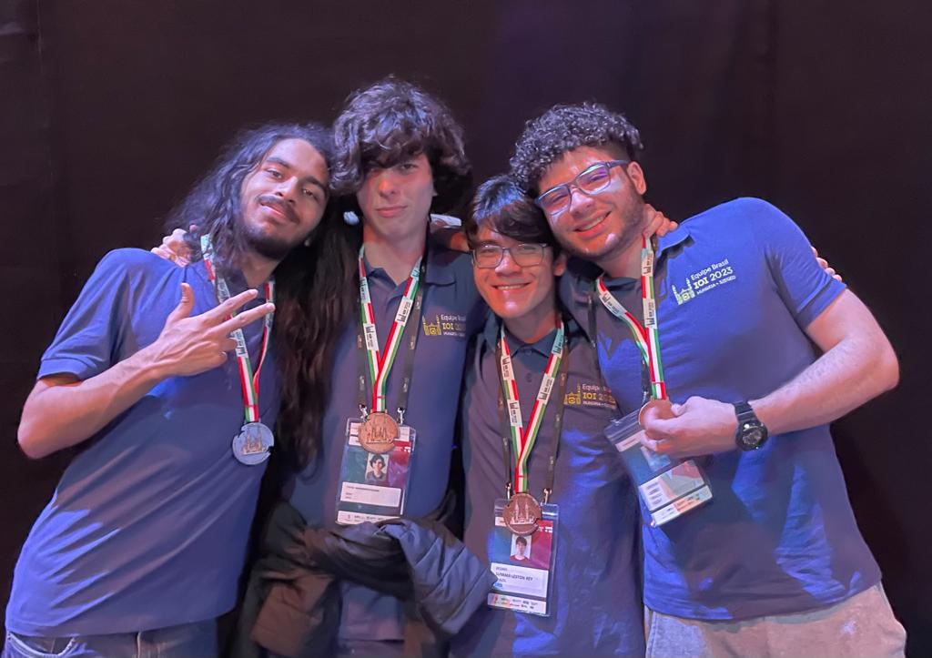 Da esq. para a dir., Leonardo Nascimento, Rafael Soares, Pedro Rey e Arthur Lopes exibem as medalhas conquistadas na IOI 2023. Foto: Arquivo pessoal