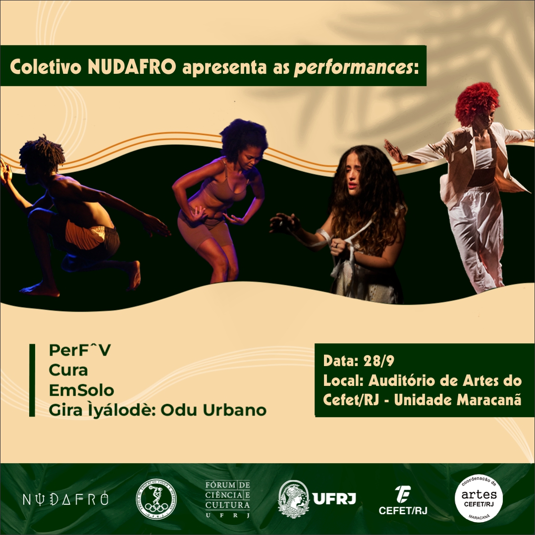 No dia 28 de setembro, o Coletivo NUDAFRO apresentará performances de dança seguidas de roda de conversa com estudantes dos cursos técnicos integrados ao ensino médio do Cefet/RJ Unidade Maracanã. O evento será realizado no Auditório de Artes, das 9h às 11h30, com as turmas do primeiro ano, o projeto de extensão GruDança e toda a comunidade escolar que queira participar. Serão apresentadas quatro performances com duração total aproximada de uma hora. Em seguida, os artistas conduzirão, junto às professoras de dança, uma roda de conversa. A atividade não exige inscrição.