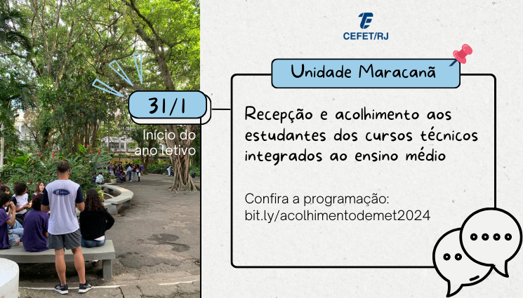 O Departamento de Ensino Médio e Técnico (DEMET) disponibilizou, nesta quinta-feira (18), a programação do evento de recepção e acolhimento aos estudantes da educação profissional técnica de nível médio da Unidade Maracanã. As atividades, que irão ocorrer de 31 de janeiro a 2 de fevereiro, marcam o início do ano letivo em 2024.