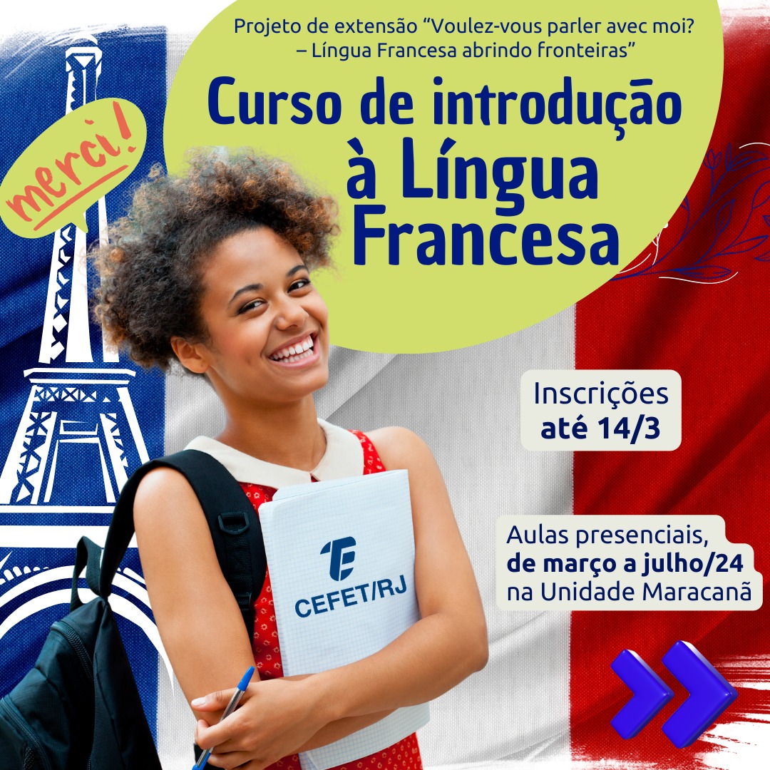 O projeto de extensão “Voulez-vous parler avec moi? – Língua Francesa abrindo fronteiras” está com inscrições abertas até 14 de março para o curso de Introdução à Língua Francesa, na Unidade Maracanã. Serão oferecidas duas turmas presenciais, uma para iniciantes e outra para quem já cursou o nível 1 ou já tenha algum conhecimento da língua. Podem se inscrever alunos, docentes e técnico-administrativos do Cefet/RJ, além da comunidade externa.