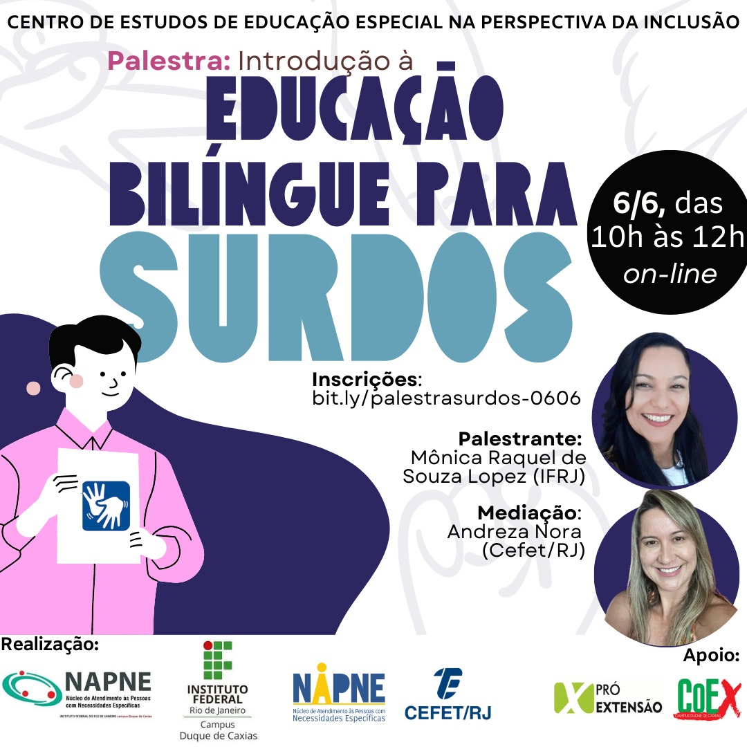 A iniciativa é promovida em parceria com o NAPNE do Instituto Federal do Rio de Janeiro (IFRJ), campus Duque de Caxias, através do projeto de extensão “Centro de estudos de educação especial na perspectiva da inclusão”. Conforme os organizadores, o primeiro encontro tem o objetivo de apresentar um breve panorama das políticas educacionais para surdos no contexto brasileiro, focalizando os avanços e dificuldades no processo de escolarização bilíngue de surdos no âmbito da educação inclusiva.