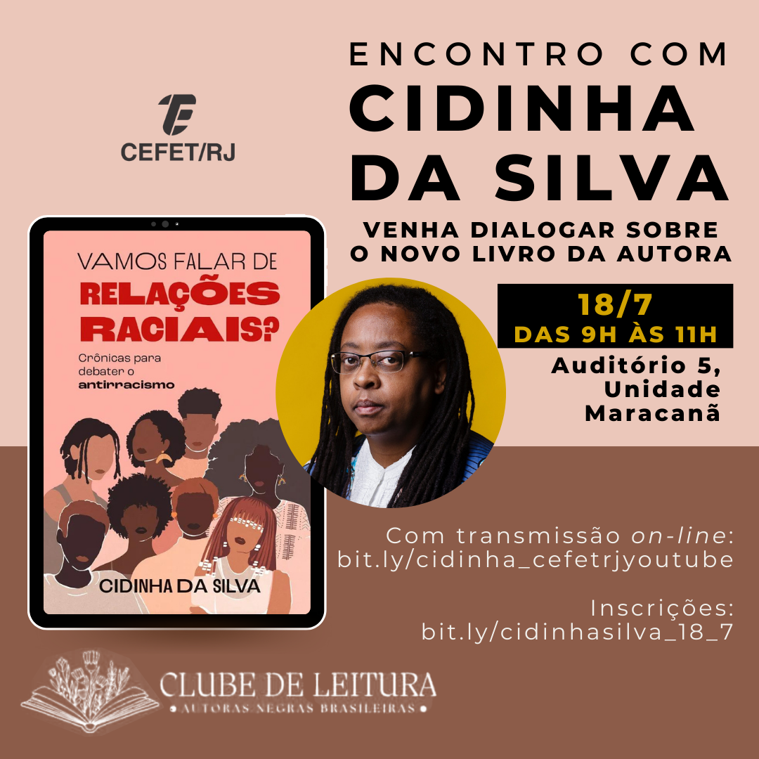 O Cefet/RJ vai receber, no dia 18 de julho, a escritora Cidinha da Silva para um encontro promovido pelo projeto de extensão Clube de Leitura: Autoras negras brasileiras. Cidinha, uma das vozes mais influentes da literatura contemporânea, abordará sua trajetória literária e discutirá sua obra mais recente, “Vamos Falar de Relações Raciais? Crônicas para debater o antirracismo”. O evento será no Auditório 5 da Unidade Maracanã, das 9h às 11h, com transmissão on-line pelo canal do Cefet/RJ no YouTube.